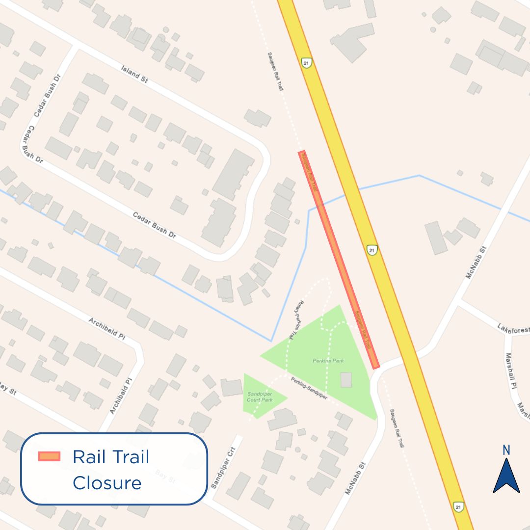 A section of the Rail Trail in Southampton between McNabb Street and the trail entrance off Cedar Creek Drive will be closed on Tuesday, September 16 at 7:30 a.m. for urgent tree maintenance. The trail will re-open at 3:00 p.m. No pedestrian traffic will be permitted on the trail during the closure.
